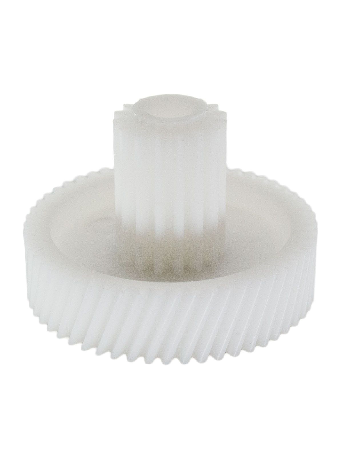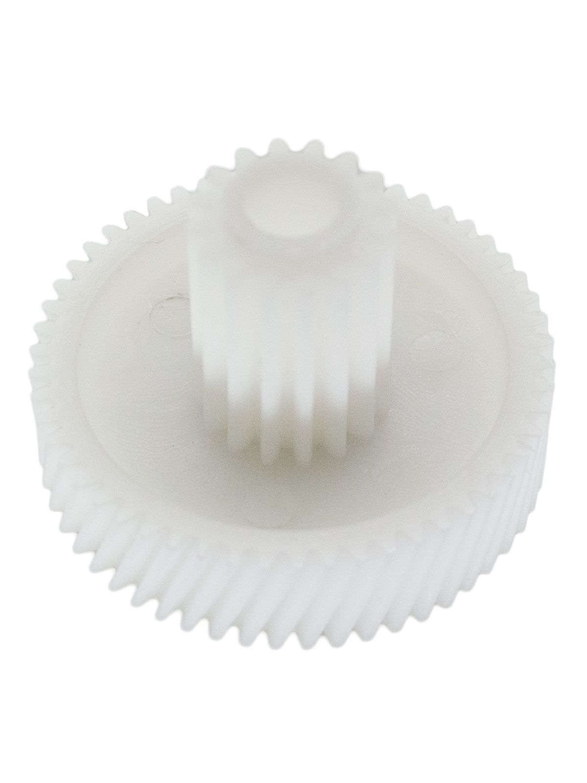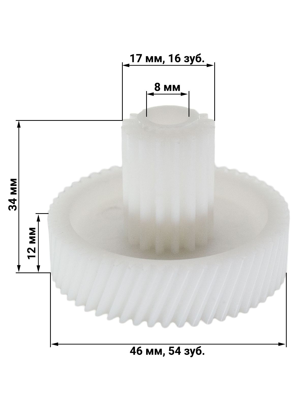 Основные характеристики:Диаметр (большой круг) 46 мм Диаметр (малый круг) 18 мм Количество зубьев (большой круг) 54 шт (косые) Количество зубьев (малый круг) 16 шт (прямые) Общая высота 35 мм Посадка на вал, диаметр 8 мм ВНИМАНИЕ: Ось нужно будет ставить со своей сломанной шестерни. По диаметру они 8мм одинаковые.